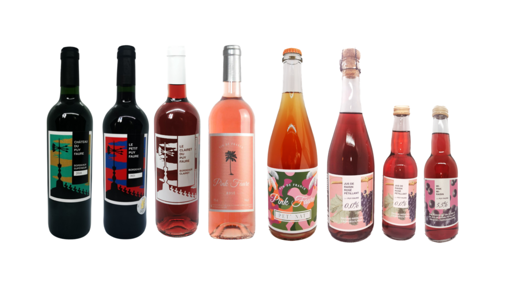 Au Château du Puy Faure, la diversité des cuvées reflète l’ambition de valoriser au mieux chaque facette du terroir : Bordeaux Supérieur rouge, Bordeaux rouge, clairet, rosé, mais aussi un pétillant naturel (Pet’Nat) et un jus de raisin pétillant pour des dégustations accessibles à tous. À côté des vins, la gamme s’élargit avec les miels de la propriété et des vinaigres fins élevés en fût de chêne, déclinés notamment à l’estragon et à la sauge, qui témoignent d’un véritable sens de la gastronomie. Cette créativité culmine avec leur cocktail « Mi Pink Mi Raisin », élaboré à partir de leurs produits et récemment couronné d’une médaille d’or au Concours des Saveurs de Nouvelle-Aquitaine, une reconnaissance qui salue à la fois l’originalité et la qualité de leur travail.